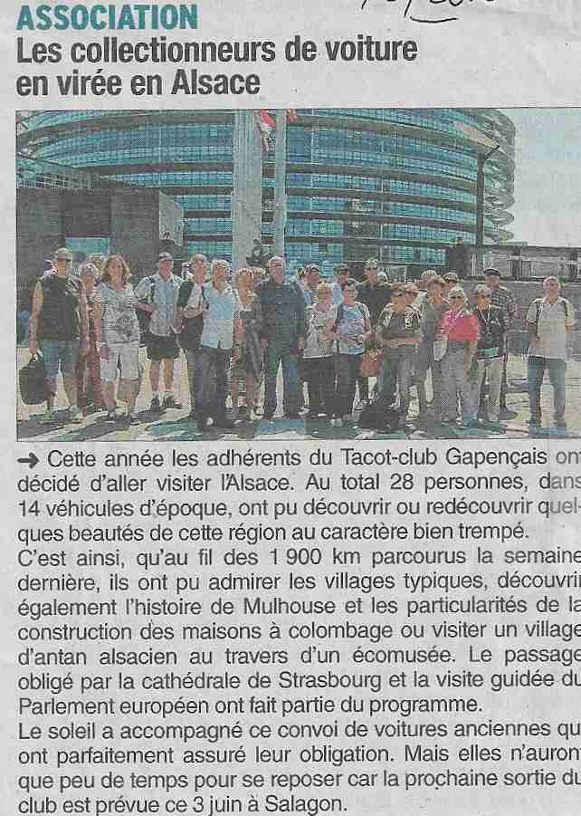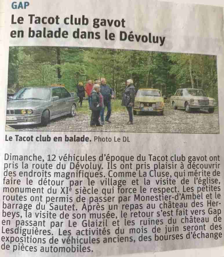 LE TACOT CLUB A PARTICIPE ACTIVEMENT A LA SORTIE NATIONALE FFVE DU 29 AVRIL 2018 , ORGANISE PAR LES VIEILLES JOYEUSES ..... PLUSIEURS VOITURES DU CLUB SE SONT RENDU SUR LE POINT DE RENCONTRE A EMBRUN Vianor . LE DEPART DU CONVOI A EU LIEUX A 9 H VERS BRIANCON AVEC UNE PAUSE CAFE , A MONT DAUPHIN . VERS 10 H 15 NOUS AVONS TRAVERSE LE VILLAGE DE GUILLESTRE.... SAINT CLEMENT ...CHATEAUROUX ....POUR FINALEMENT NOUS IMMOBILISER DANS LA RUE PIETONNE D ' EMBRUN... CET ARRET A FAVORISE LARGEMENT LES DISCUSSIONS ENTRE PASSIONNEES ET PASSANTS . ENFIN , APERITIF , REPAS AU RESTAURANT OU PIC NIC . LE PARC FERME A EU DU SUCCES POUR CETTE BELLE JOURNEE AUTOMOBILE ......
