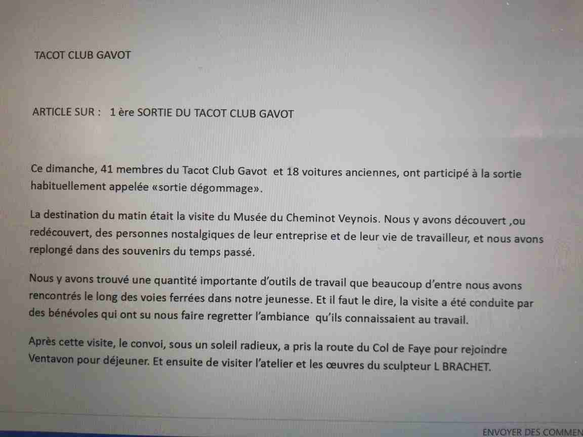 LE TACOT CLUB A PARTICIPE ACTIVEMENT A LA SORTIE NATIONALE FFVE DU 29 AVRIL 2018 , ORGANISE PAR LES VIEILLES JOYEUSES ..... PLUSIEURS VOITURES DU CLUB SE SONT RENDU SUR LE POINT DE RENCONTRE A EMBRUN Vianor . LE DEPART DU CONVOI A EU LIEUX A 9 H VERS BRIANCON AVEC UNE PAUSE CAFE , A MONT DAUPHIN . VERS 10 H 15 NOUS AVONS TRAVERSE LE VILLAGE DE GUILLESTRE.... SAINT CLEMENT ...CHATEAUROUX ....POUR FINALEMENT NOUS IMMOBILISER DANS LA RUE PIETONNE D ' EMBRUN... CET ARRET A FAVORISE LARGEMENT LES DISCUSSIONS ENTRE PASSIONNEES ET PASSANTS . ENFIN , APERITIF , REPAS AU RESTAURANT OU PIC NIC . LE PARC FERME A EU DU SUCCES POUR CETTE BELLE JOURNEE AUTOMOBILE ......
